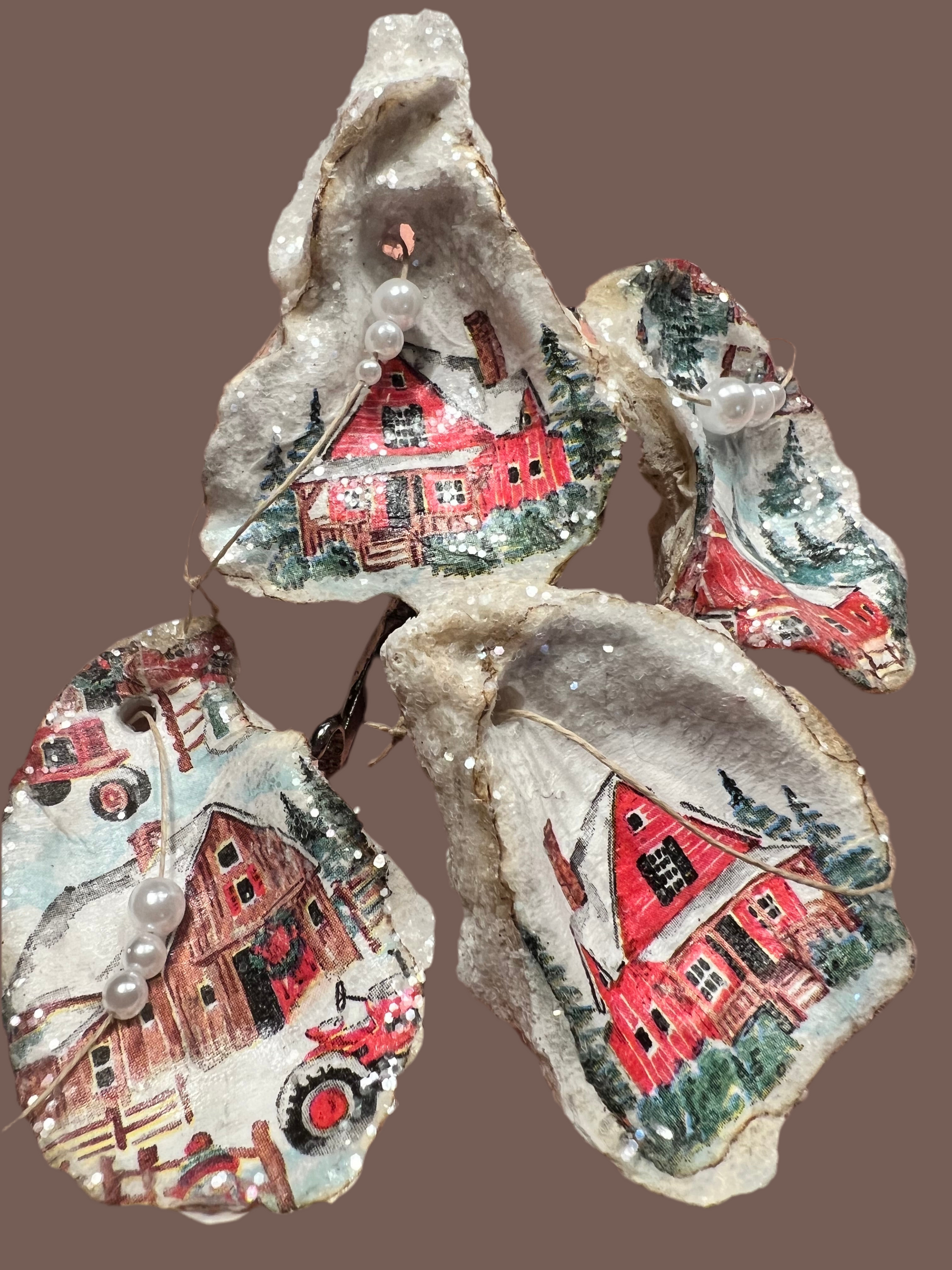 Bleached and scrubbed oysters with Mod, podge and Resin, glitter, gold paint