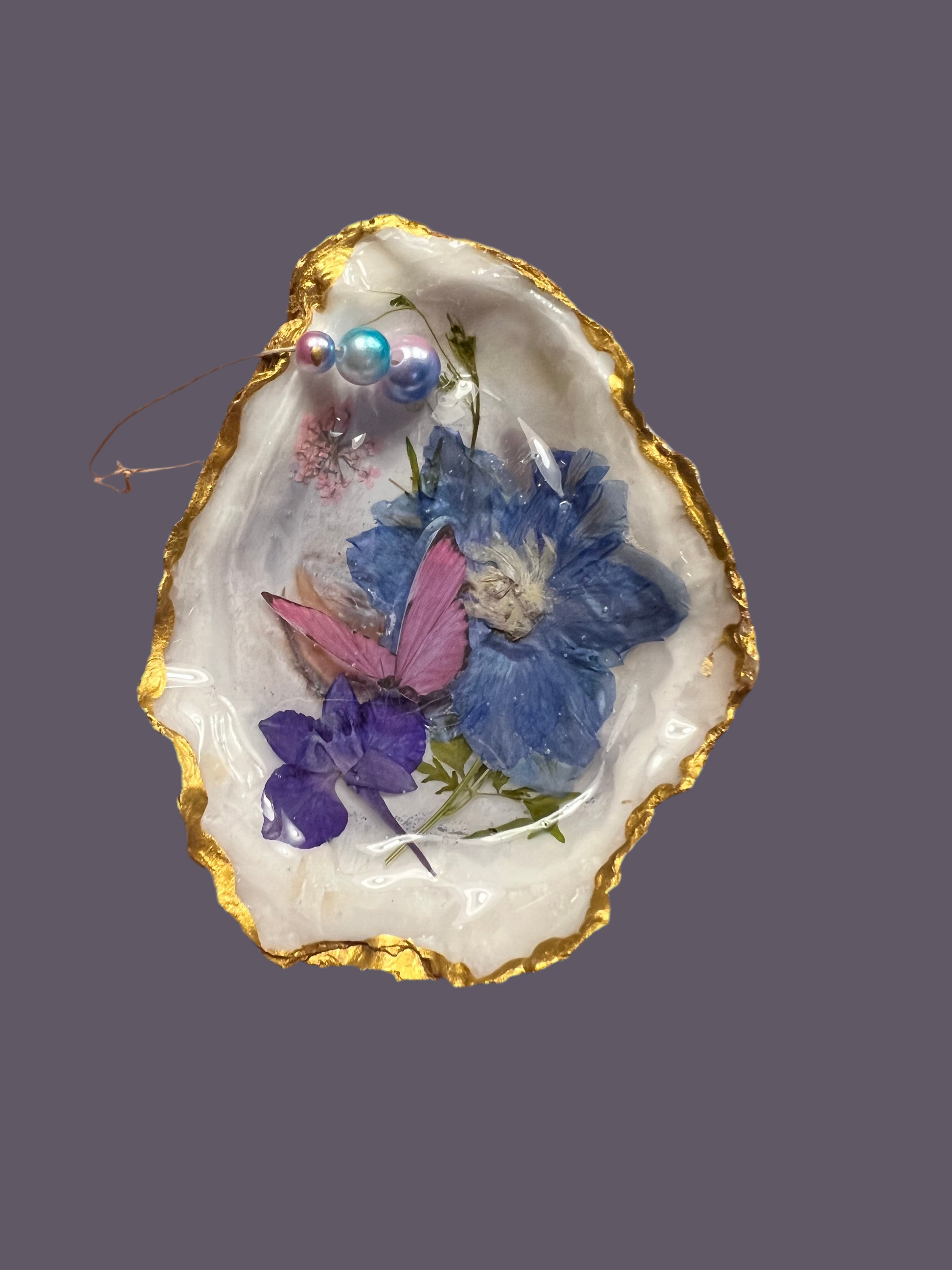 Bleached and scrubbed oyster shell with decoupage And pressed flowers with resin and Beads.
