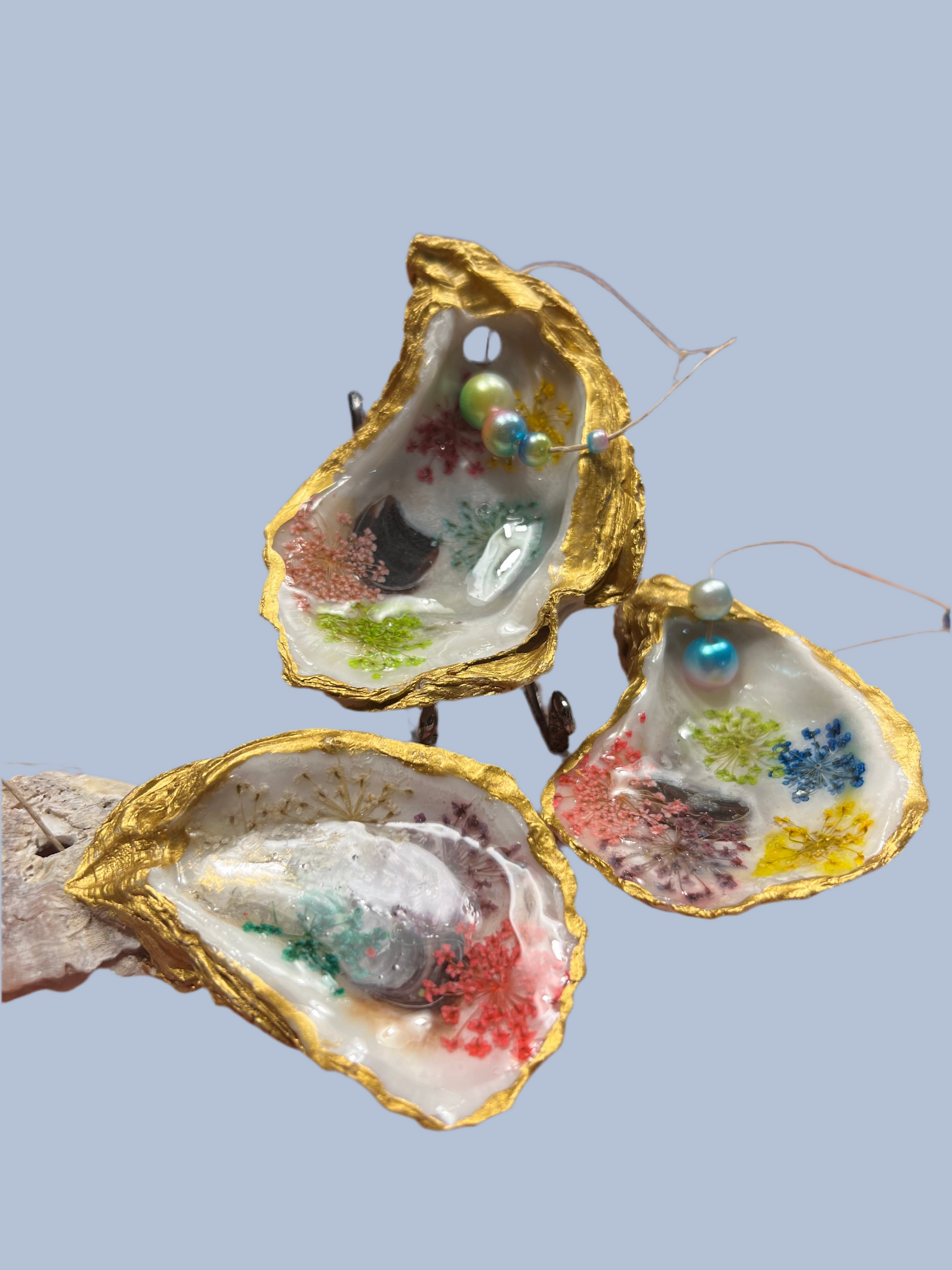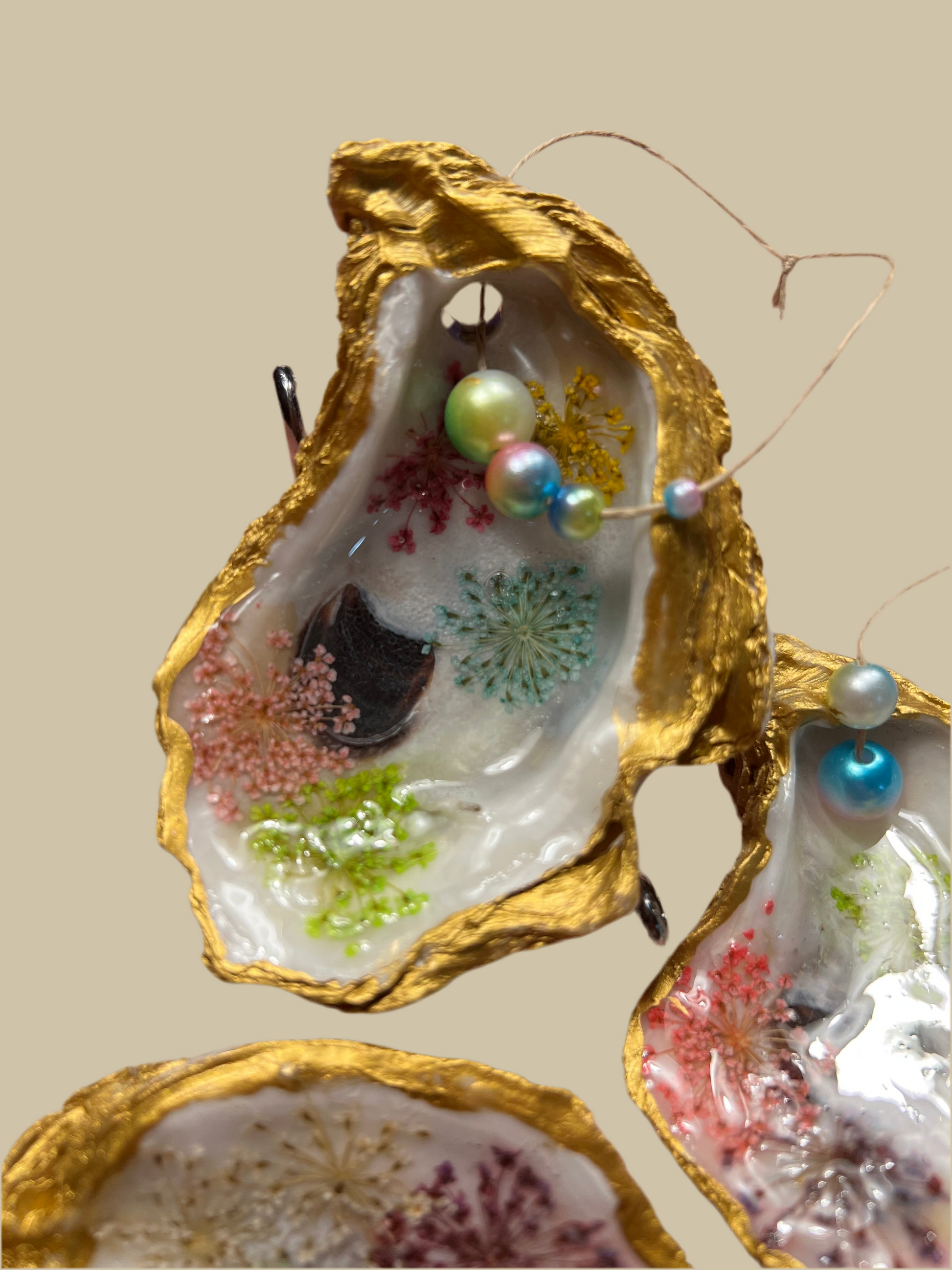 Scrubbed and bleached oyster shells with resin acrylic paint and beads